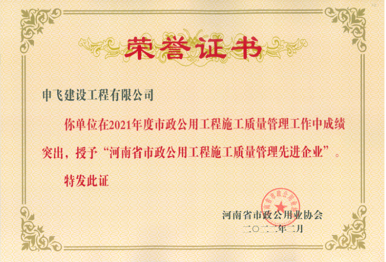 - [04-12]申飛建工再獲“省先進施工企業”、 “市政金杯獎”等多項榮譽